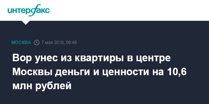 Москва. 7 мая. INTERFAX.RU - Ценности почти на 10,6 млн рублей украдены из квартиры в центре Москвы, сообщили "Интерфаксу" в понедельник в пресс-службе столичного главка МВД РФ.