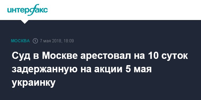 Москва. 7 мая. INTERFAX.RU - Тверской суд Москвы назначил десять суток административного ареста гражданке Украины Владиславе Соловей за неповиновение полиции на протестной акции 5 мая в центре столицы.