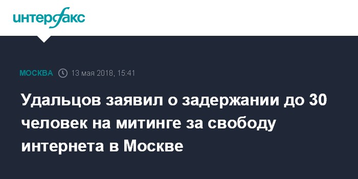 Москва. 13 мая. INTERFAX.RU - Сотрудники правоохранительных органов задержали до 30 человек на митинге "За свободный интернет", который проходит на проспекте Сахарова в Москве, сообщил координатор "Левого фронта" Сергей Удальцов.