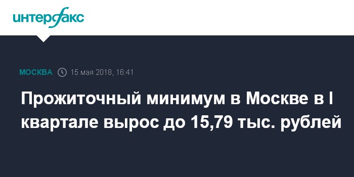 Москва. 15 мая. INTERFAX.RU - Величина прожиточного минимума на душу населения в Москве по итогам первого квартала составила 15 786 рублей, что на 389 рублей больше, чем в четвертом квартале 2017 года, следует из проекта постановления правительства столицы, подготовленного департаментом труда и соцзащиты населения.