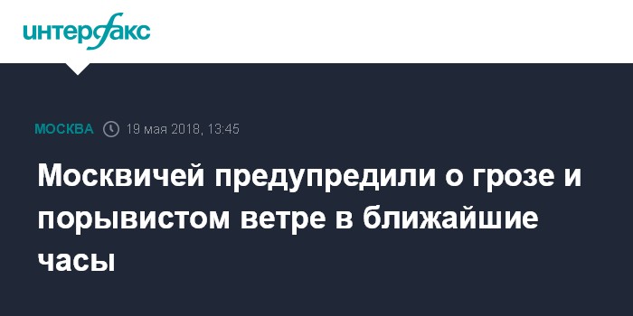Москва. 19 мая. INTERFAX.RU - Гроза и сильный ветер с порывами до 17 м/сек придут в Москву в ближайшие часы, сообщили "Интерфаксу" в субботу в пресс-службе столичного главка МЧС.