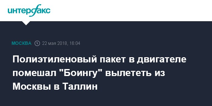 Москва. 22 мая. INTERFAX.RU - Попавший на старте в двигатель самолета полиэтиленовый пакет не дал накануне взлететь пассажирскому "Боингу" в "Шереметьево", сообщил "Интерфаксу" источник в авиадиспетчерских службах.