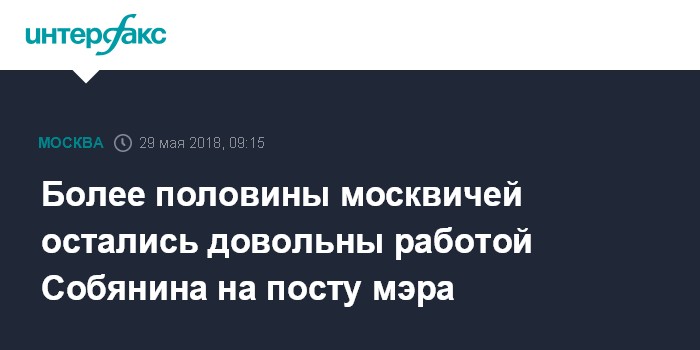 Москва. 29 мая. INTERFAX.RU - Более половины жителей российской столицы положительно оценивают деятельность действующего мэра Москвы Сергея Собянина, свидетельствуют данные опроса "Левада-центра", поступившие в "Интерфакс".