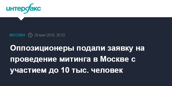 Москва. 29 мая. INTERFAX.RU - Представители оппозиции подали в мэрию Москвы заявку на проведение митинга в центре Москвы 10 июня, сообщили "Интерфаксу" организаторы мероприятия во вторник.
