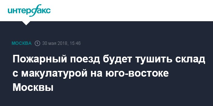 Москва. 30 мая. INTERFAX.RU - Площадь пожара на складе с макулатурой в Москве выросла до 350 квадратных метров, тушить его будут с помощью пожарного поезда, сообщил "Интерфаксу" осведомленный источник.
