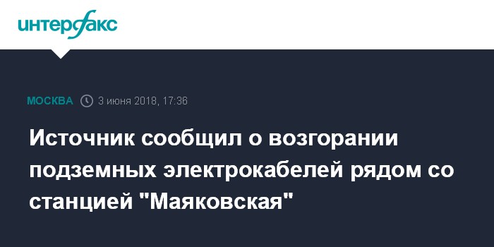 Москва. 3 июня. INTERFAX.RU - Подземные кабели загорелись рядом со станцией метро "Маяковская" в Москве, сообщил "Интерфаксу" осведомленный источник.