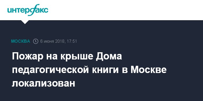 Москва. 6 июня. INTERFAX.RU - Локализовано возгорание кровли в здании, где расположен Дом педагогической книги, на месте дежурят более 12 пожарных расчетов, сообщили в пресс-службе столичного главка МЧС РФ.