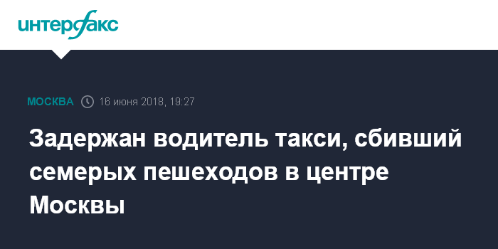 Москва. 16 июня. INTERFAX.RU - Сбивший семерых человек в центре Москвы водитель такси задержан, сообщили "Интерфаксу" в субботу в пресс-службе столичного главка полиции.