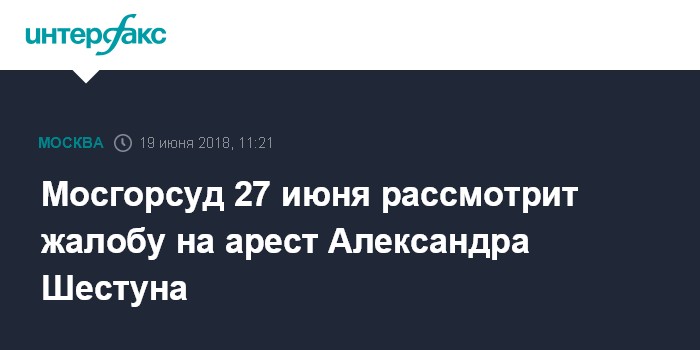 "Рассмотрение апелляционной жалобы на постановление суда, которым в отношении Шестуна избрана мера пресечения в виде заключения под стражу, назначено на 27 июня в 12:00", - сообщила Царева.