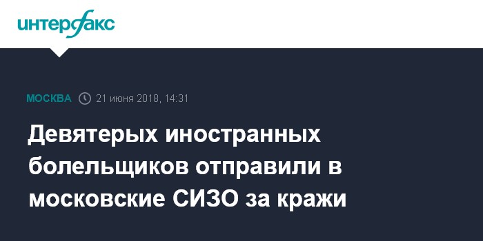Москва. 21 июня. INTERFAX.RU - В следственных изоляторах Москвы содержатся девять приехавших в Россию на чемпионат мира по футболу иностранных граждан, арестованных за кражи, сообщил "Интерфаксу" в четверг ответственный секретарь Общественной наблюдательной комиссии (ОНК) Москвы Иван Мельников.