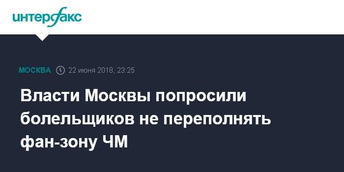 Москва. 22 июня. INTERFAX.RU - Столичные власти просят футбольных болельщиков не переполнять фан-зоны в дни особенно популярных матчей Чемпионата мира по футболу FIFA, чтобы не создавать опасных ситуаций.