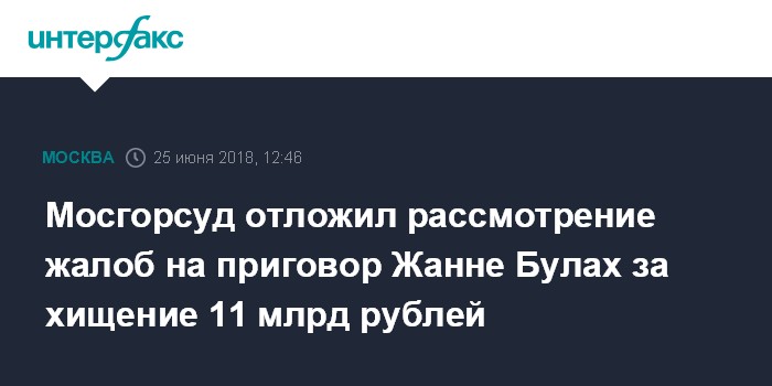 Москва. 25 июня. INTERFAX.RU - Мосгорсуд отложил рассмотрение апелляционных жалоб на заочный приговор жене бывшего первого вице-премьера Московской области Алексея Кузнецова гражданке США Жанне Булах, осужденной за хищение более 11 млрд рублей из бюджета Московской области, передает корреспондент "Интерфакса".