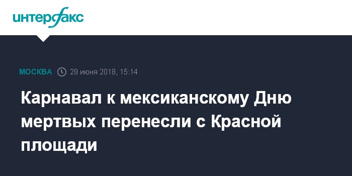 Накануне в оргкомитете национального дома болельщиков Мексики "Интерфаксу" сообщили, что мексиканский праздник День мертвых пройдет в центре Москвы 29 июня. Он должен был начаться с парада на Красной площади и закончиться развлекательной программой в национальном доме болельщиков в Гостином дворе.