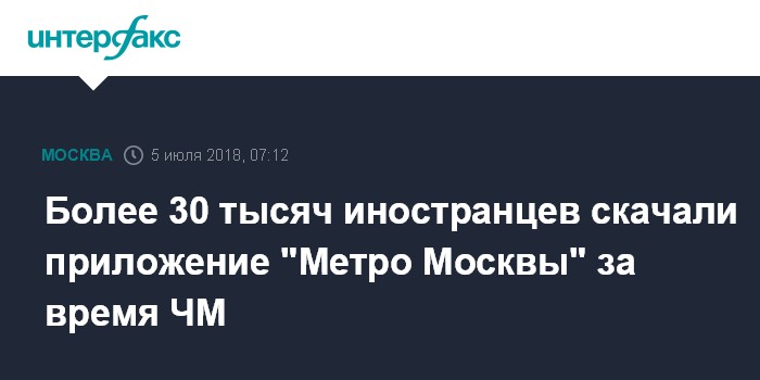 Москва. 5 июля. INTERFAX.RU - Мобильное приложение "Метро Москвы" скачали более 30 тыс. иностранцев с начала старта Чемпионата мира по футболу, сообщил в четверг заместитель мэра столицы по вопросам транспорта Максим Ликсутов "Интерфаксу".