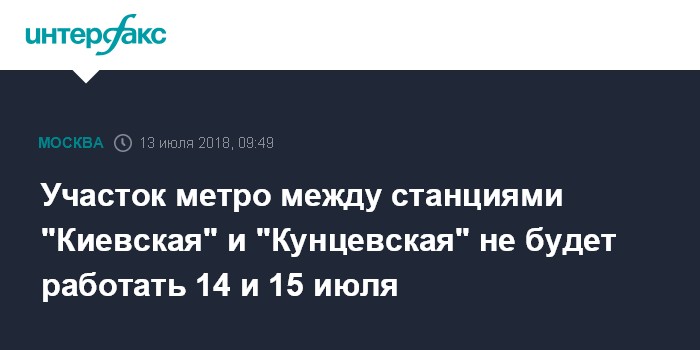 Москва. 13 июля. INTERFAX.RU - Движение поездов между станциями "Киевская" и "Кунцевская" Филевской линии московского метро будет приостановлено 14 и 15 июля, сообщили "Интерфаксу" в пятницу в пресс-службе подземки.
