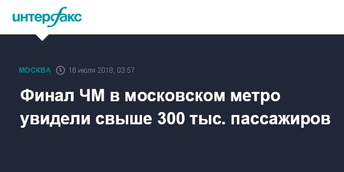 Москва. 16 июля. INTERFAX.RU - Прямую трансляцию финала Чемпионата мира по футболу на экранах в вагонах московского метро в воскресенье посмотрели более 310 тыс. пассажиров, сообщили "Интерфаксу" в департаменте транспорта столицы.