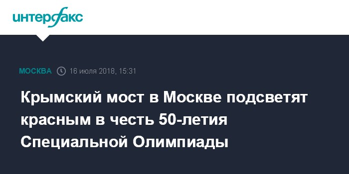 Москва. 16 июля. INTERFAX.RU - В честь 50-летнего юбилея Специальной Олимпиады - движения поддержки лиц с ментальными нарушениями - Крымский мост в центре Москвы получит красную подсветку, сообщил президент Специальной Олимпиады России Юрий Смирнов "Интерфаксу" в понедельник.