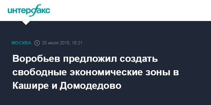 Москва. 25 июля. INTERFAX.RU - Губернатор Подмосковья Андрей Воробьев обратился к премьер-министру России Дмитрию Медведеву с инициативой создания двух новых свободных экономических зон в Подмосковье.