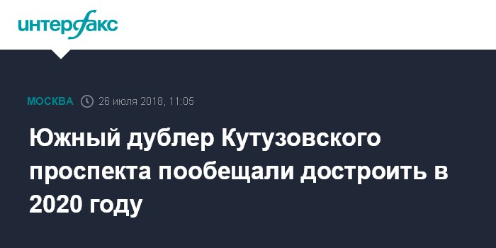 Москва. 26 июля. INTERFAX.RU - Создание Южного дублера Кутузовского проспекта планируется завершить в 2020 году, сообщает пресс-служба столичного департамента строительства в четверг.