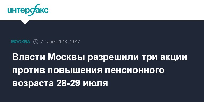 Власти Москвы разрешили три акции против повышения пенсионного возраста 28-29 июля