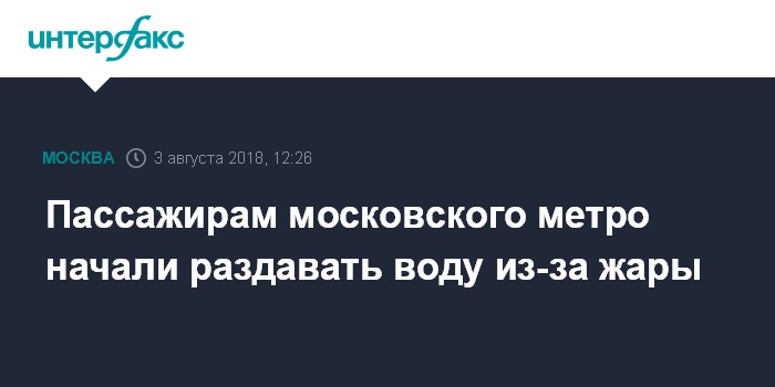 Москва. 3 августа. INTERFAX.RU - В связи с установившейся жаркой погодой и повышением температуры на отдельных станциях Московского метрополитена пассажирам раздают воду, сообщили "Интерфаксу" в пресс-службе подземки в пятницу.