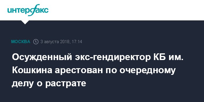 Осужденный экс-гендиректор КБ им. Кошкина арестован по очередному делу о растрате