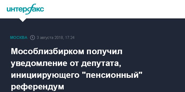 Ранее на этой неделе вопрос на референдум ("Согласны ли вы с тем, что установленный законодательством Российской Федерации о пенсионном обеспечении по состоянию на 1 июля 2018 года возраст, достижение которого дает право на назначение страховой пенсии по старости (для мужчин - 60 лет, для женщин - 55 лет), повышаться не должен?") был направлен Московскую городскую избирательную комиссию.