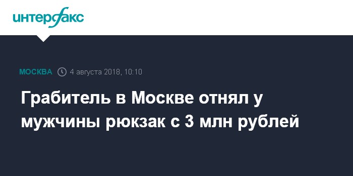 Москва. 4 августа. INTERFAX.RU - Мужчина заявил в полицию, что грабитель похитил у него рюкзак с 3 млн рублей на юге Москвы, проводится проверка, сообщили "Интерфаксу" в пресс-службе столичного главка полиции.