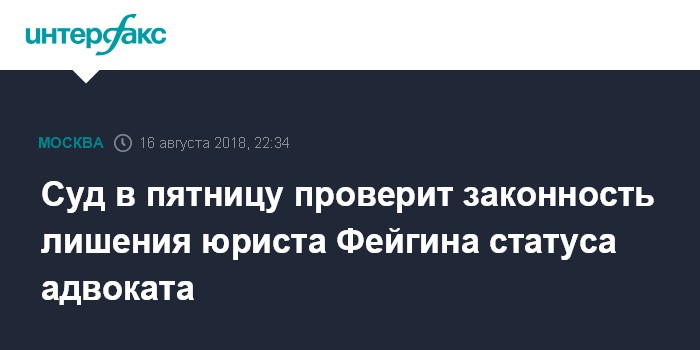 Москва. 16 августа. INTERFAX.RU - Хамовнический суд Москвы в пятницу рассмотрит иск юриста Марка Фейгина к Адвокатской палате Москвы о признании незаконным решения о лишении его адвокатского статуса. В иске юрист просит отменить решение Совета Палаты и восстановить его статус адвоката.