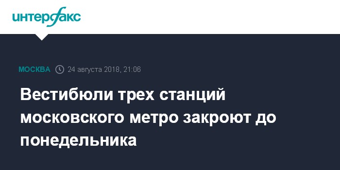 Москва. 24 августа. INTERFAX.RU - Вестибюли трех станций Московского метрополитена будут закрыты до утра понедельника в связи с ремонтными работами, сообщили "Интерфаксу" в пресс-службе подземки.