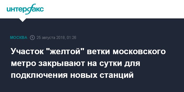 Москва. 25 августа. INTERFAX.RU - В связи с работами по подключению нового участка к Солнцевской линии Московского метрополитена с семью станциями в течение субботы не будет движения поездов между станциями "Раменки" и "Шелепиха", сообщили "Интерфаксу" в пресс-службе подземки.