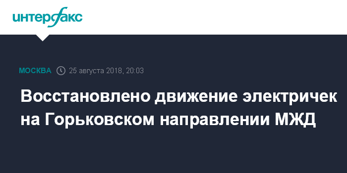 Москва. 25 августа. INTERFAX.RU - На Горьковском направлении Московской железной дороги (МЖД) в субботу вечером было восстановлено движение электропоездов, ранее затрудненное по технической причине, сообщила пресс-служба МЖД.