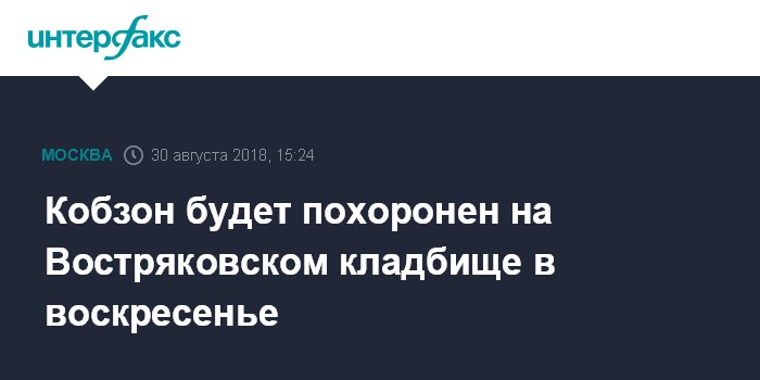 Москва. 30 августа. INTERFAX.RU - Народный артист СССР Иосиф Кобзон будет похоронен 2 сентября на Востряковском кладбище, рядом с матерью, сообщил "Интерфаксу" в четверг источник в московской мэрии.
