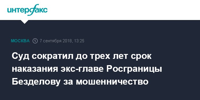 Москва. 7 сентября. INTERFAX.RU - Мосгорсуд пересчитал срок реального лишения свободы осужденному на девять лет заключения за мошенничество бывшему руководителю Федерального агентства по обустройству государственной границы РФ Дмитрию Безделову.