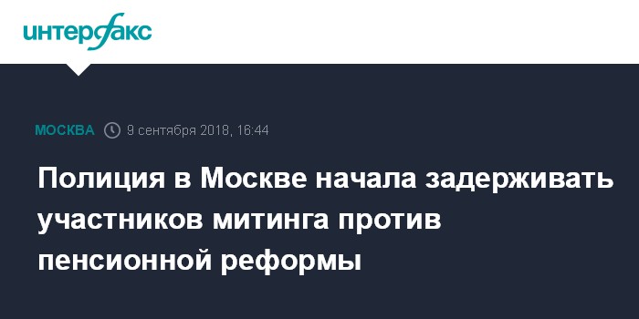 Москва. 9 сентября. INTERFAX.RU - Полиция начала задерживать участников несогласованной акции оппозиции против повышения пенсионного возраста в центре Москвы.