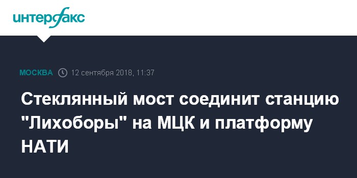 Москва. 12 сентября. INTERFAX.RU - Платформу НАТИ Октябрьской железной дороги и станцию "Лихоборы" на МЦК соединит стеклянный мост, сообщает в среду сайт мэрии Москвы.
