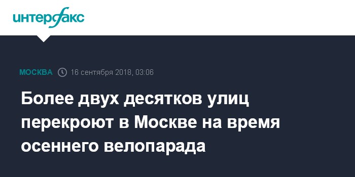 Москва. 16 сентября. INTERFAX.RU - В связи с проведением в столице в воскресенье днем осеннего велопарада, более двух десятков улиц временно закроют для движения автомобильного транспорта, сообщили "Интерфаксу" в Центре организации дорожного движения.