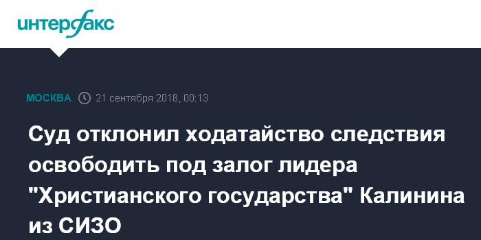 Москва. 20 сентября. INTERFAX.RU - Хамовнический суд Москвы отказался отпустить из следственного изолятора под залог лидера организации "Христианское государство" Александра Калинина, обвиняемого в принуждении кинотеатров к отказу от показа фильма "Матильда" и экстремизме, передает корреспондент "Интерфакса".
