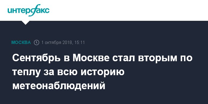 Москва. 1 октября. INTERFAX.RU - Прошедший сентябрь в Москве стал вторым в рейтинге самых теплых за всю историю метеонаблюдений.