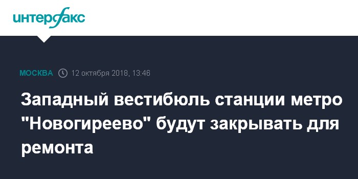 "С 23:00 пятницы, 12 октября, до открытия метрополитена в понедельник, 15 октября, для ремонта будет закрыт западный вестибюль станции "Новогиреево" (выход к с/к "Феникс"). Для входа в метро и выхода в город пассажиры смогут пользоваться восточным вестибюлем (выход к/т "Киргизия")", - сообщили "Интерфаксу" в пятницу в пресс-службе Московского метрополитена.