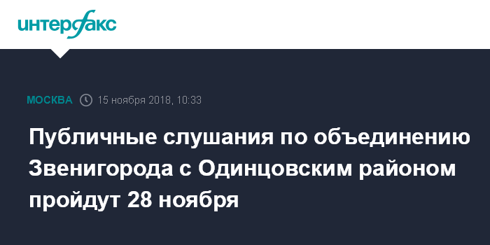 Москва. 15 ноября. INTERFAX.RU - В подмосковном Звенигороде в среду, 28 ноября, пройдут публичные слушания по вопросу объединения с Одинцовским районом, сообщила "Интерфаксу" председатель совета депутатов городского округа Лариса Белоусова.