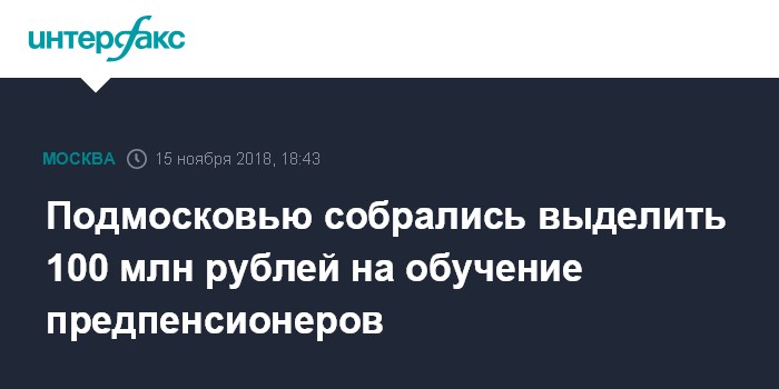 Москва. 15 ноября. INTERFAX.RU - Министерство социального развития Московской области рассчитывает на получение субсидии из федерального бюджета для организации в 2019 году обучения жителей региона предпенсионного возраста, сообщила в четверг глава ведомства Ирина Фаевская.