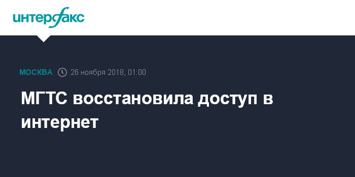 Москва. 26 ноября. INTERFAX.RU - "Московская городская телефонная сеть" (МГТС) восстановила интернет, доступ к которому отсутствовал у абонентов оператора в воскресенье вечером, сообщили "Интерфаксу" в компании.