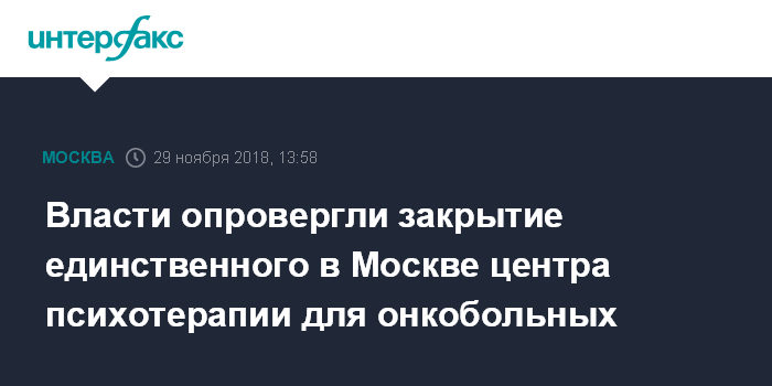 Москва. 29 ноября. INTERFAX.RU - Департамент здравоохранения российской столицы опроверг информацию, распространяемую рядом СМИ, о закрытии единственного в Москве отделения психотерапии для онкобольных в городской клинической больнице имени Бахрушиных.