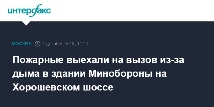 "Поступила информация о задымлении в административном здании Министерства обороны по адресу Хорошёвское шоссе, 40А.", - сказал собеседник агентства. Эта информация проверяется, добавил он.