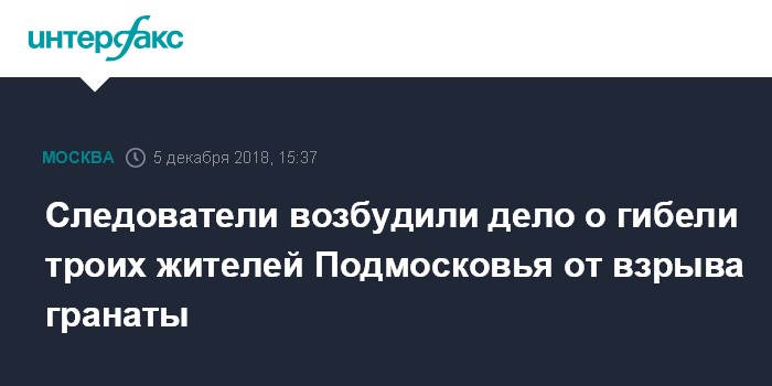 Москва. 5 декабря. INTERFAX.RU - Следователи квалифицировали гибель трех человек от разрыва боеприпаса в Орехово-Зуевском районе Подмосковья как непредумышленное убийство, сообщила представитель областного главка Следственного комитета (СК) Евгения Кирюшина.