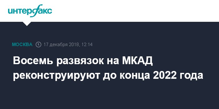 Москва. 17 декабря. INTERFAX.RU - Реконструкцию восьми транспортных развязок на МКАДе планируется завершить до конца 2022 года, сообщил журналистам в понедельник глава департамента строительства Москвы Андрей Бочкарев.