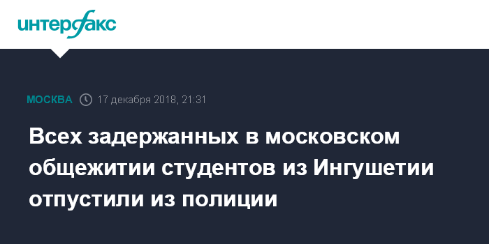 Москва. 17 декабря. INTERFAX.RU - Задержанных в понедельник утром ингушских студентов Российского государственного геологоразведочного университета имени Серго Орджоникидзе (МГРИ-РГГРУ) отпустили из полиции, сообщили в понедельник агентству "Интерфакс" в пресс-службе постпредства республики в Москве.