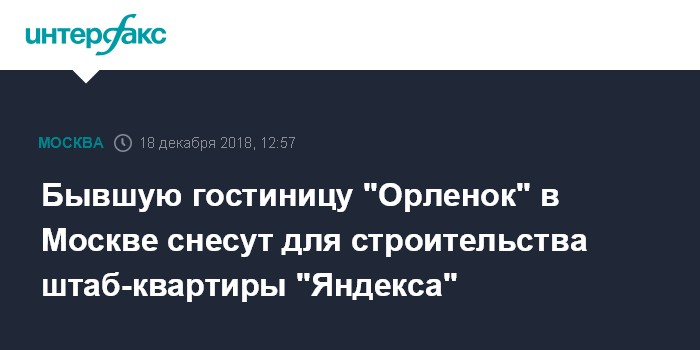 Москва. 18 декабря. INTERFAX.RU - Здание бывшей гостиницы "Орленок" в Москве, находящееся на земельном участке, приобретенном компанией "Яндекс" под строительство штаб-квартиры, будет снесено, рассказал "Интерфаксу" руководитель департамента офисной недвижимости (аренда помещений) Cushman & Wakefield Дмитрий Тарасов.