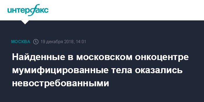 Москва. 19 декабря. INTERFAX.RU - Национальный медицинский исследовательский центр онкологии им.Н.Н.Блохина Минздрава России разъяснил, что найденные в клинике четыре мумифицированных тела ранее не были востребованы родственниками и сейчас они переданы правоохранительным органам.